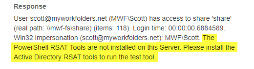"The PowerShell RSAT Tools are not installed on this Server. Please install the Active Directory RSAT tools to run the test tool."