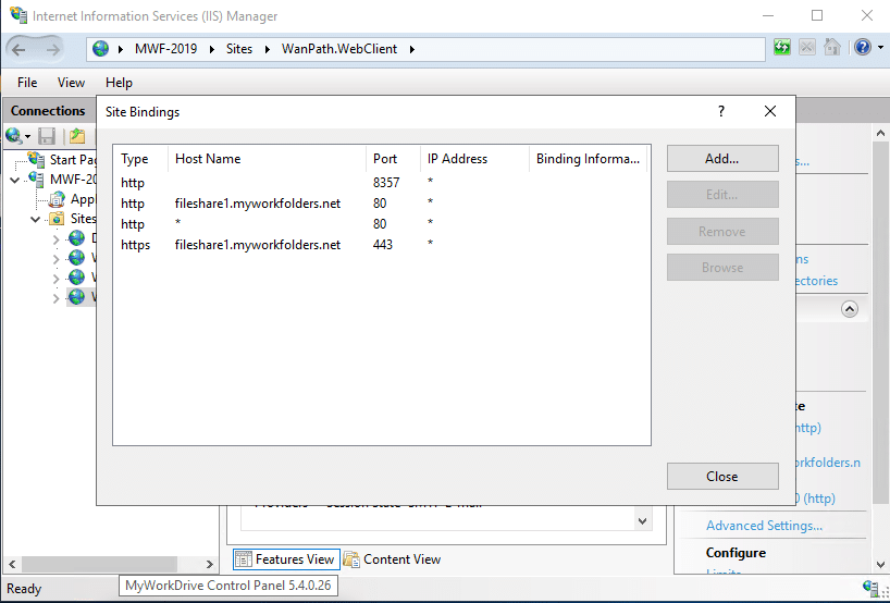 Open IIS, open the WanPath.WebClient site and click on Bindings. You should see that an HTTPS entry has been added for your site – in our case, fileshare1.myworkfolders.net