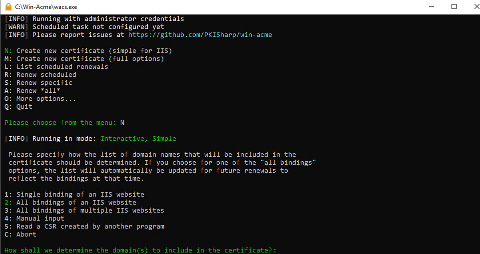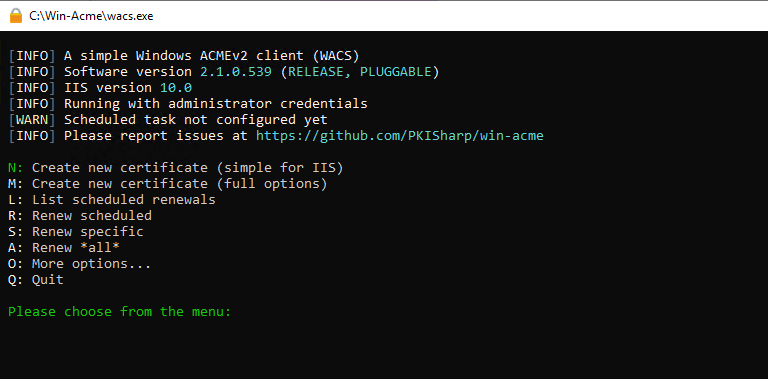Launch a command prompt as Administrator and browse to the folder you saved Win-Acme in. Run wacs.exe. It will launch a DOS window with a list of questions.