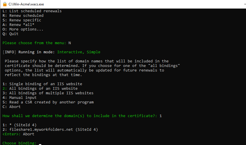 You’ll get a list of the websites on your server (which should only be a single SiteId since we only set port 80 on one website). Choose the option with the domain name, in our case 2: fileshare1.myworkfolders.net (SiteId 4)