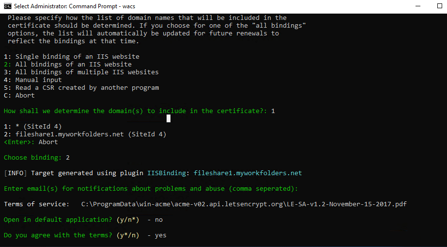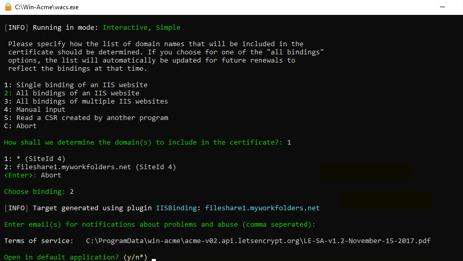 When prompted, enter your email. The Win-acme client will send you reminder emails to renew your site.