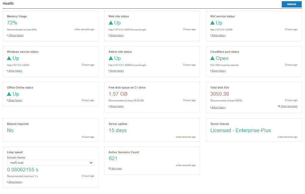 The new Health dashboard will provide feedback on critical services, memory and server readiness with repair recommendations and automated fix tools. The Health dashboard will aid you in ensuring your MyWorkDrive server is performing optimally by periodically testing the components that make up the MyWorkDrive solution - including the host server, Active Directory and file shares.