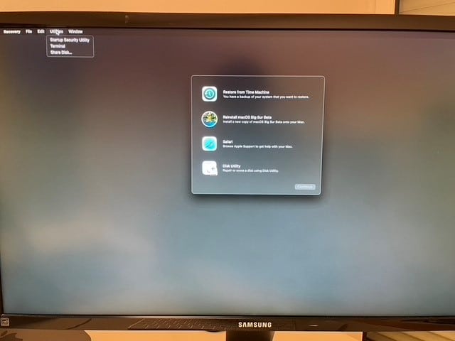 Once you are in the Recovery Environment, from the utilities menu, choose the Startup Security Utility from Utilities.