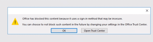 When users open Office documents in local Office from the web client, users with new/updated versions of Microsoft Office installed locally may receive a warning about opening documents from online sources, referencing the Trust Center.