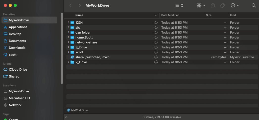 The MyWorkDrive macOS network drive client runs as an application on macOS and maps network drives on Macs directly in Finder, as if the computer were locally on the network. Once installed, Users can browse/copy/drag/drop/edit/delete and create files on their available network shares as if they were in the office!