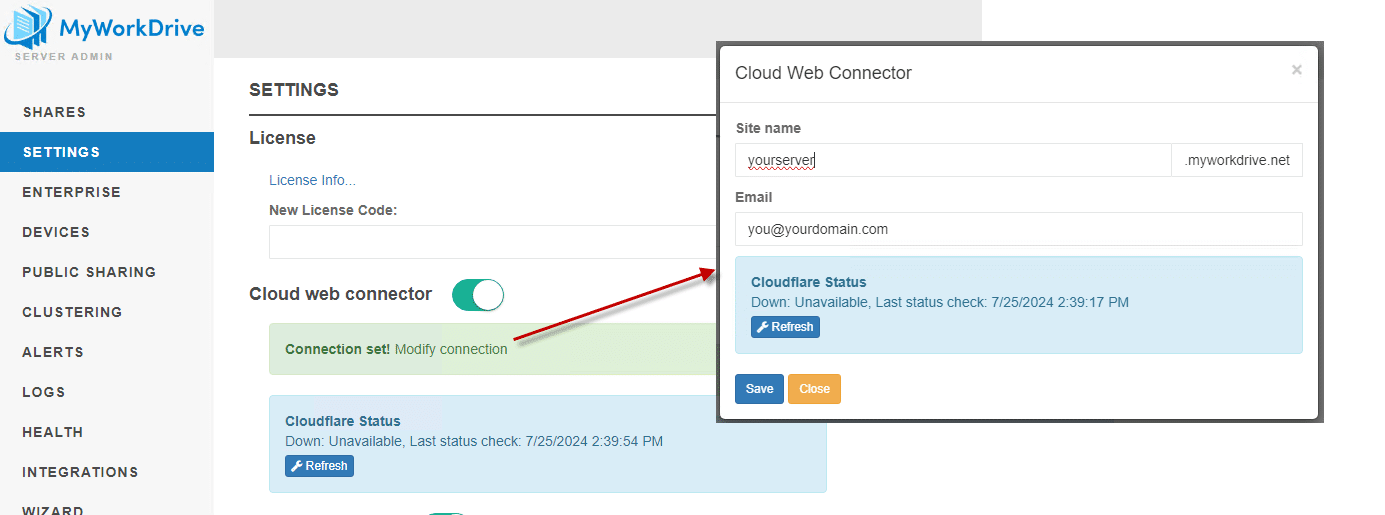 ie yourserver@myworkdrive.net, but Cloud Web Connector is later disabled in favor of publishing on a company domain (i.e., server.yourcompany.com).