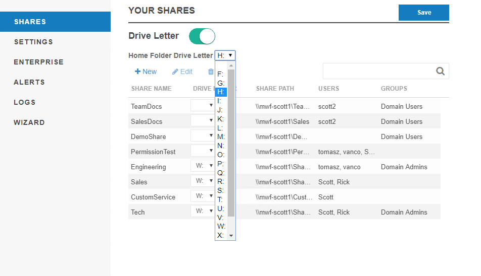 The Multiple Map Drive feature is available on the Share settings in the Admin panel. Enable the slider for Drive Letter.