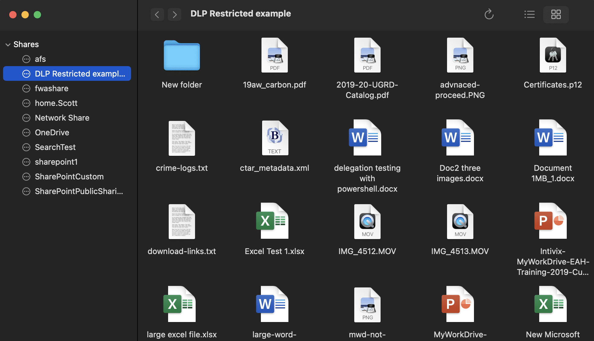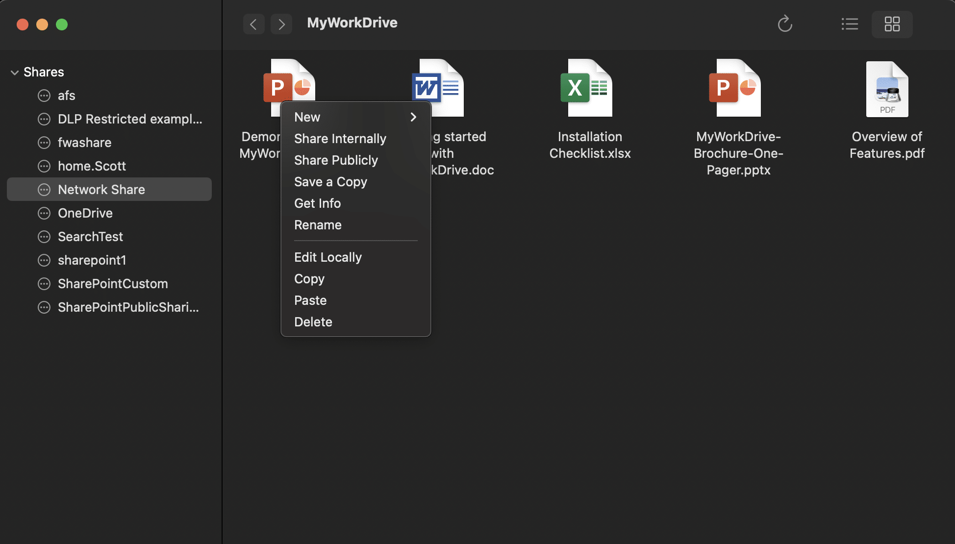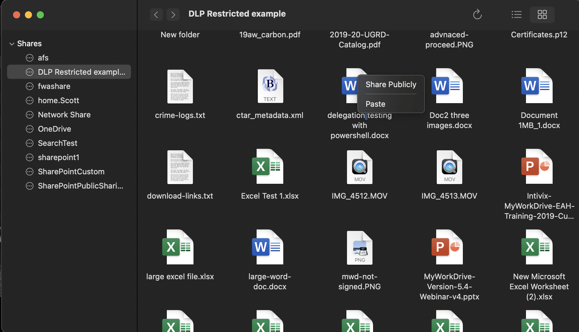In non-restricted (non-DLP) shares, the most common functionality is supported, including Copy, Paste, Drag, Drop, Delete, Rename, View, and Info.