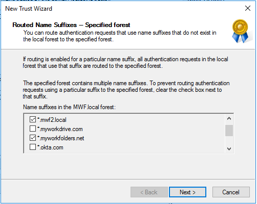 MyWorkDrive supports placement in an Active Directory Trust Resource Domain with the following limitations. SAML/SSO only works with Two-Way trusts. With One-Way trusts, Users can only log in using Username/Password – SAML/SSO is not supported as it requires impersonating the user in the Trusted Account domain by the MWD Server located in the resource domain, which is not permitted. Two-way trusts are the preferred option. Two-way trusts support selective authentication to limit permissions from the resource domain on the Trusted Account domain and can be adjusted as needed.