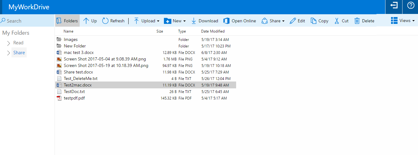 The MyWorkDrive web file manager portal provides web file access to users’ files and folders. Upon logging in with their existing Windows domain credentials, users are presented with the web file manager to manage their work files and folders. The web file access client provides access to upload and download of files and folders, search, direct editing of office documents locally and in Microsoft Office Online, and our mapped drive client feature, which opens the shares in the user’s operating system (File Explorer) using a mapped drive over https (SSL). Drag and drop of files and folders is supported.