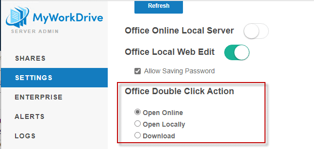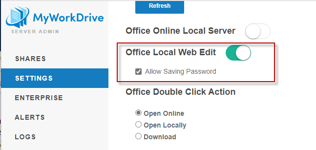 The ability to open in local Office from the web client is enabled by default; however, the administrator may choose to disable it. It is disabled in Settings with the radio button "Office Local Web Edit".