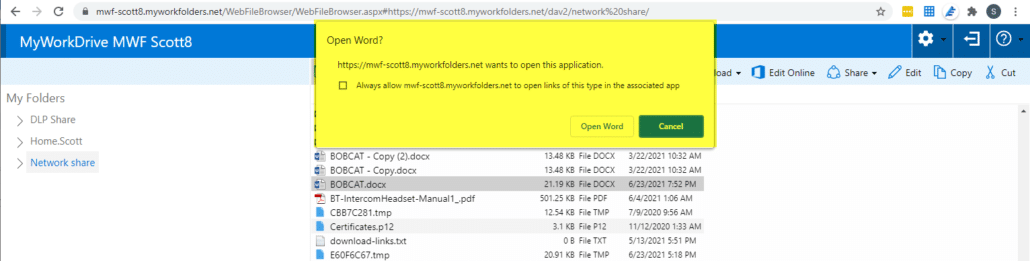 MyWorkDrive's implementation of MSOFBA includes additional security precautions to harden against misuse, including restricting access exclusively to requests from Office Products via MSOFBA, limiting functions available to MSOFBA to read/write (there is no browse, create, delete, etc), and requiring the user to re-authenticate when opening an office document.