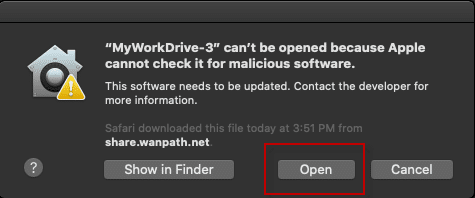 If you are installing MyWorkDrive on Mojave (10.14) or Catalina (10.15), you may receive a warning about Apple being unable to check for malicious software, preventing the software from being run. Earlier versions of MyWorkDrive were not notarized with Apple, and preview builds may also not be notarized. To confirm running the software, you must authorize it through Security & Privacy in System Settings. You will only need to complete this process the first time you run this version of MyWorkDrive. If you receive this message.