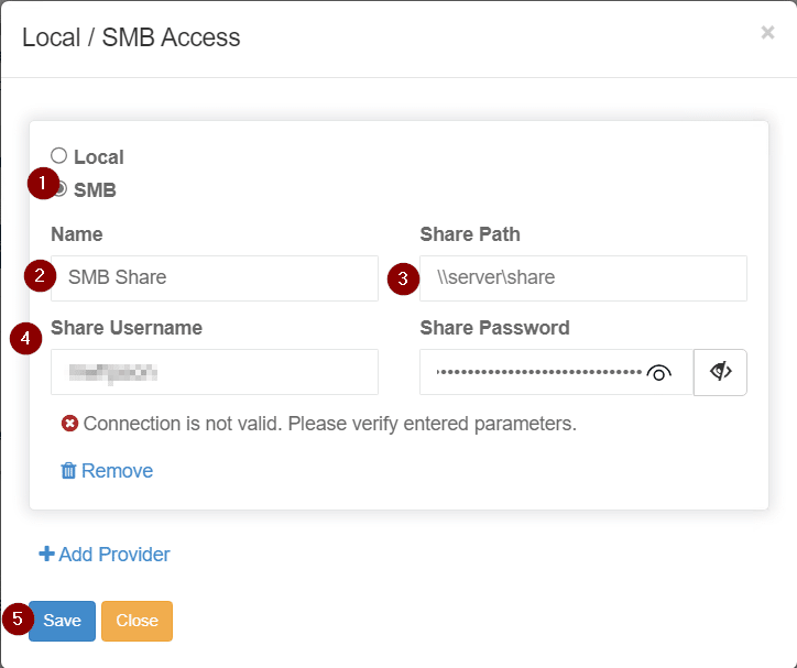 Change the radio option to SMB, enter a name for the SMB share connection, enter the Share Path, enter a service account with full control permissions to the share, and select Save.