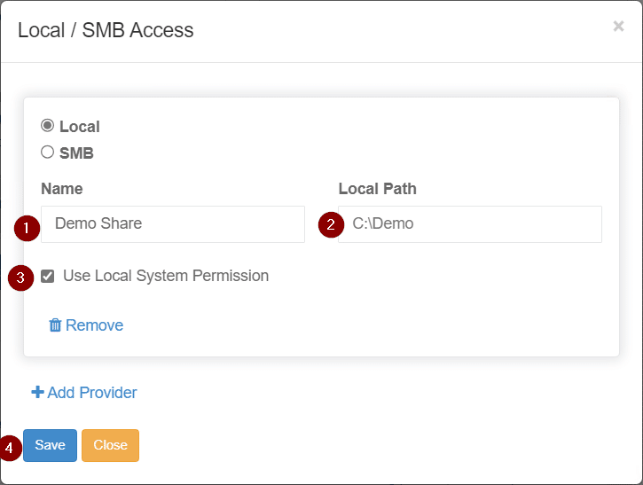 Choose a name for your local share, enter the path for the local share, and choose to either use the local system permissions or enter service account information and select Save.