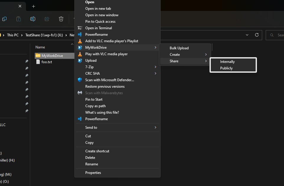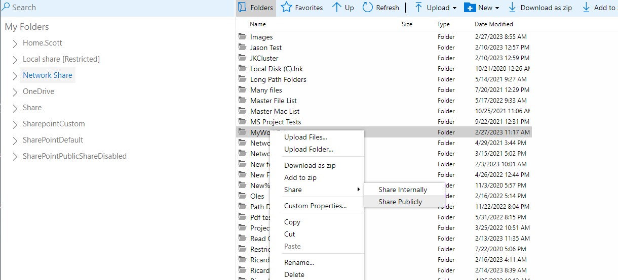 Public Sharing is a feature that was added in addition to existing sharing options in MyWorkDrive, including Share Internal, OneDrive/Outlook Sharing, and Guest User Access.