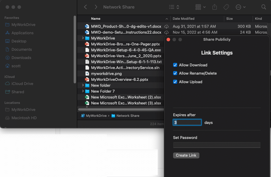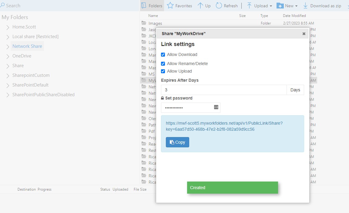 Starting with version 6.4, MyWorkDrive includes a new feature, Public Sharing, which allows users to securely collaborate with people outside their organization, such as business partners, vendors, clients, or customers, without requiring them to have a MyWorkDrive account. Users are able to generate a publicly accessible link to share via email, chat, etc.