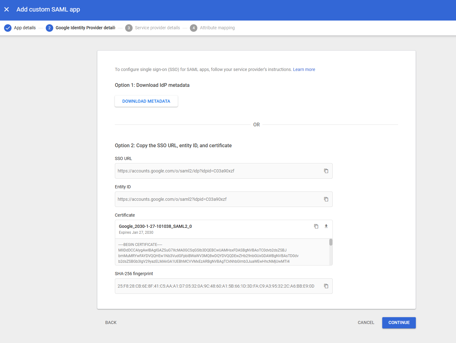 1) SSO Url. This will be used as the SingleSignOnServiceURL and will appear in the format https://accounts.google.com/o/saml2/idp?idpid=$string
