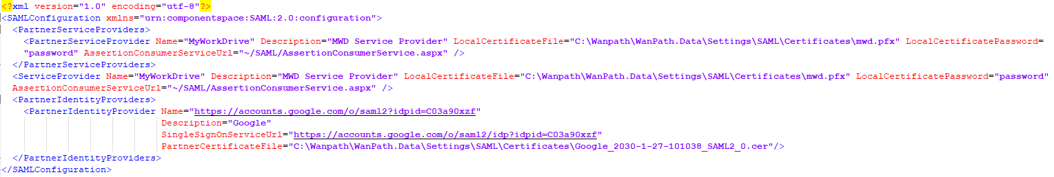 <PartnerServiceProvider Name="MyWorkDrive" Description="MWD Service Provider" LocalCertificateFile="C:\Wanpath\WanPath.Data\Settings\SAML\Certificates\mwd.pfx" LocalCertificatePassword="password" AssertionConsumerServiceUrl="~/SAML/AssertionConsumerService.aspx" />