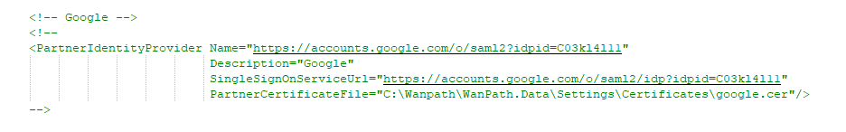 PartnerCertificateFile="C:\Wanpath\WanPath.Data\Settings\SAML\Certificates\Google_2030-1-27-101038_SAML2_0.cer"/>