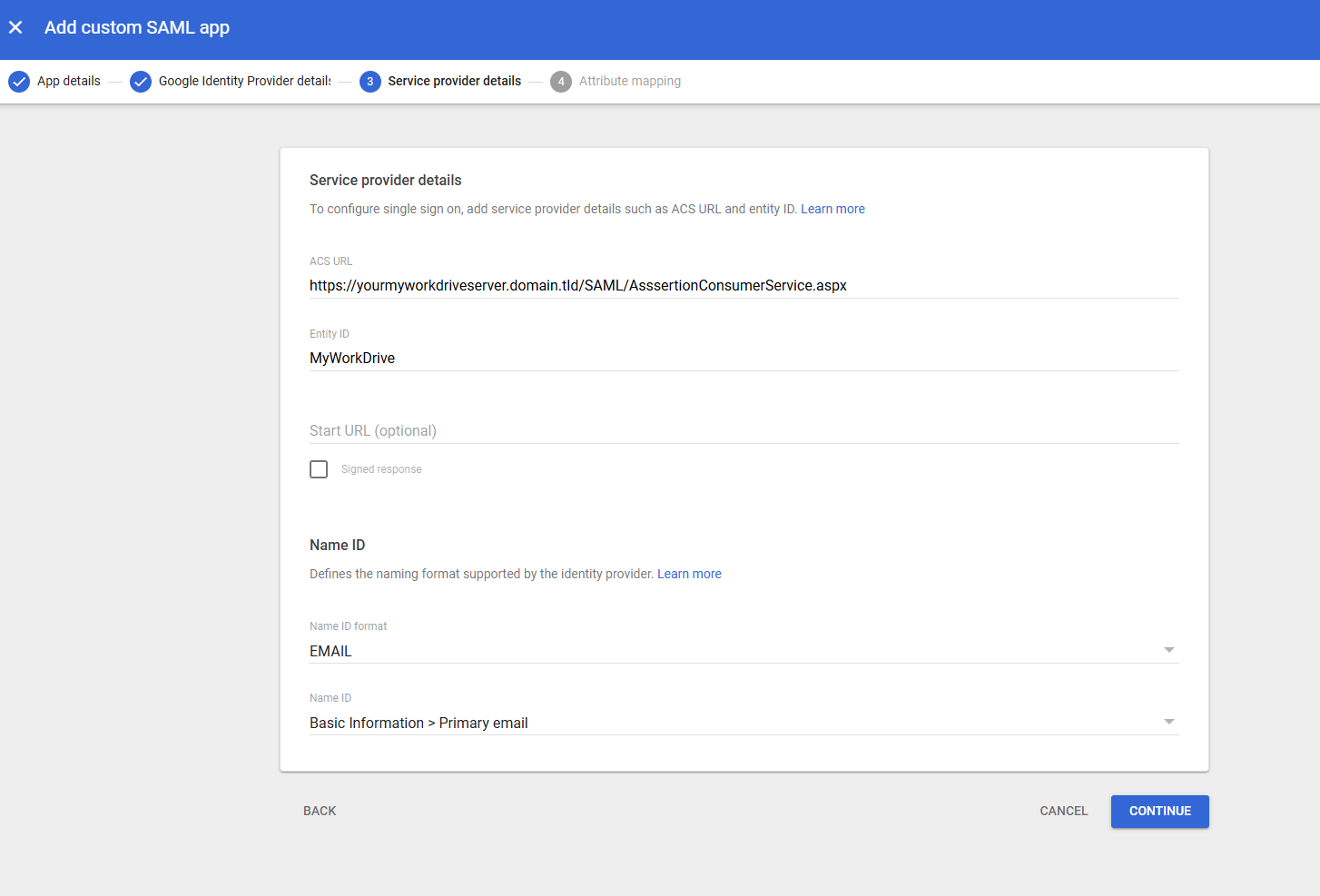 Google to be able to pass the SAML authortization back to MyWorkDrive via the Assertion Consumer Service URL.