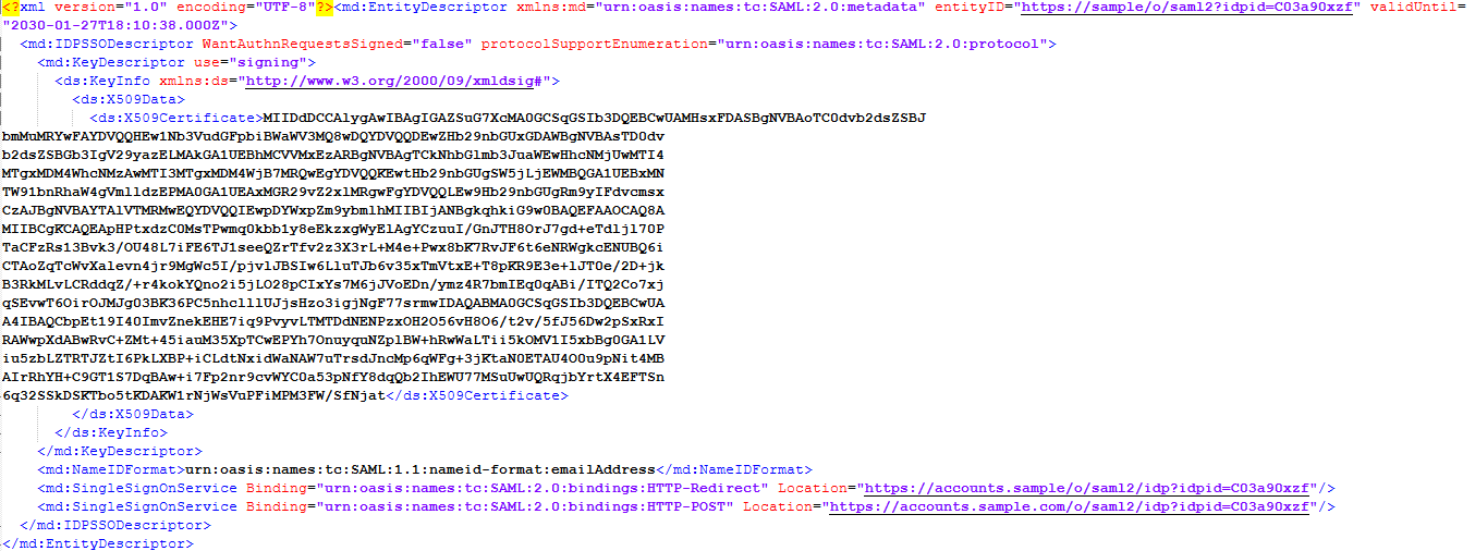 - Different indentity providers may require other settings such as SignAuthnRequest, or WantAssertionsSigned. Set those values as required for your identity provider.