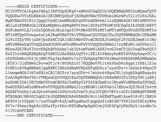 If your SAML provider does not offer a certificate download, you may find the certificate information provided in a metadata file and can use that to create the cer file with a text editor. Be sure to include the header/footer and line breaks as demonstrated.