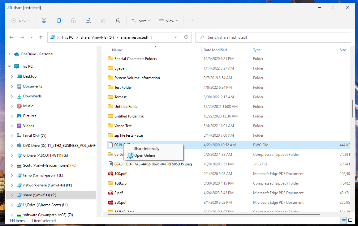 Access and permission to files and folders will be limited. Files cannot be renamed or deleted. They cannot be copied or dragged out of the share. They can be viewed by double-clicking in the MyWorkDrive online viewer (with print, save, and clipboard restrictions). Optionally, Office online editing can be enabled, which permits editing in Office online via the browser.