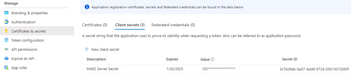 Note the client secret expiration. This will need to be renewed before it expires and updated on each MyWorkDrive Server in the future.