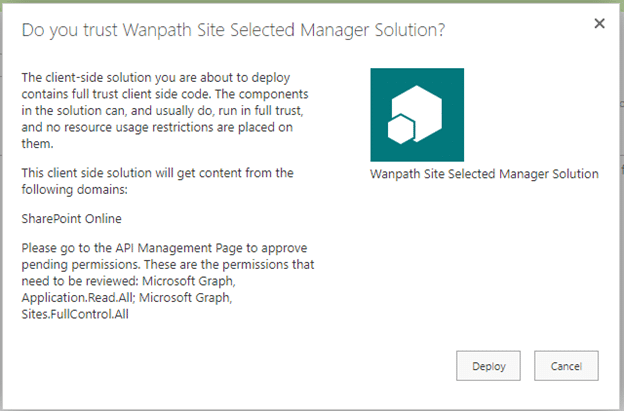 Deploy wanpath-site-selected-manager-solution.sppkg to app catalog.