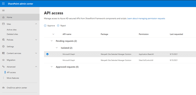 Go to Site-admin.sharepoint.com > home > advanced > API Access (this takes a few moments to load and might show some warnings while loading), then click approve for both Microsoft Graph permissions.