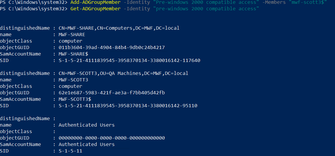 Add-ADGroupMember -Identity "Pre-windows 2000 compatible access" -Members "MWDServer$"