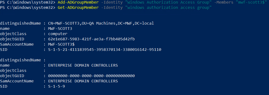 Add-ADGroupMember -Identity "Windows Authorization Access Group" -Members "MWDServer$"