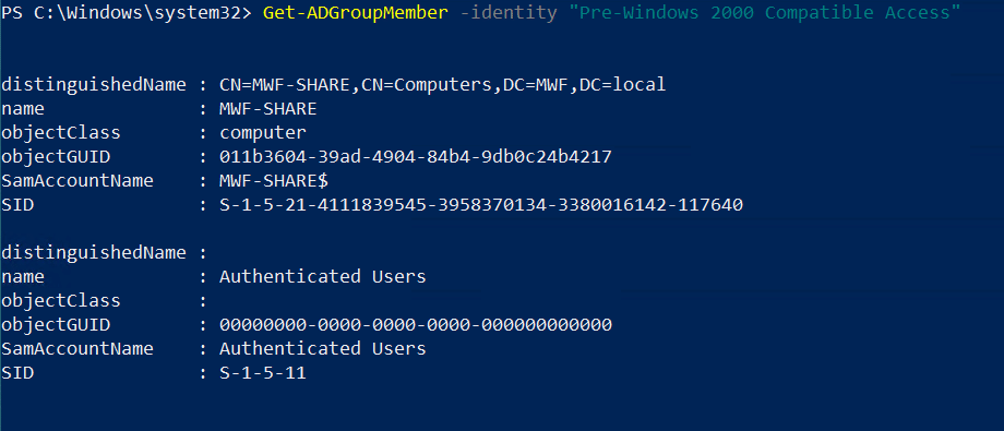 Get-ADGroupMember -Identity "pre-windows 2000 compatible access"