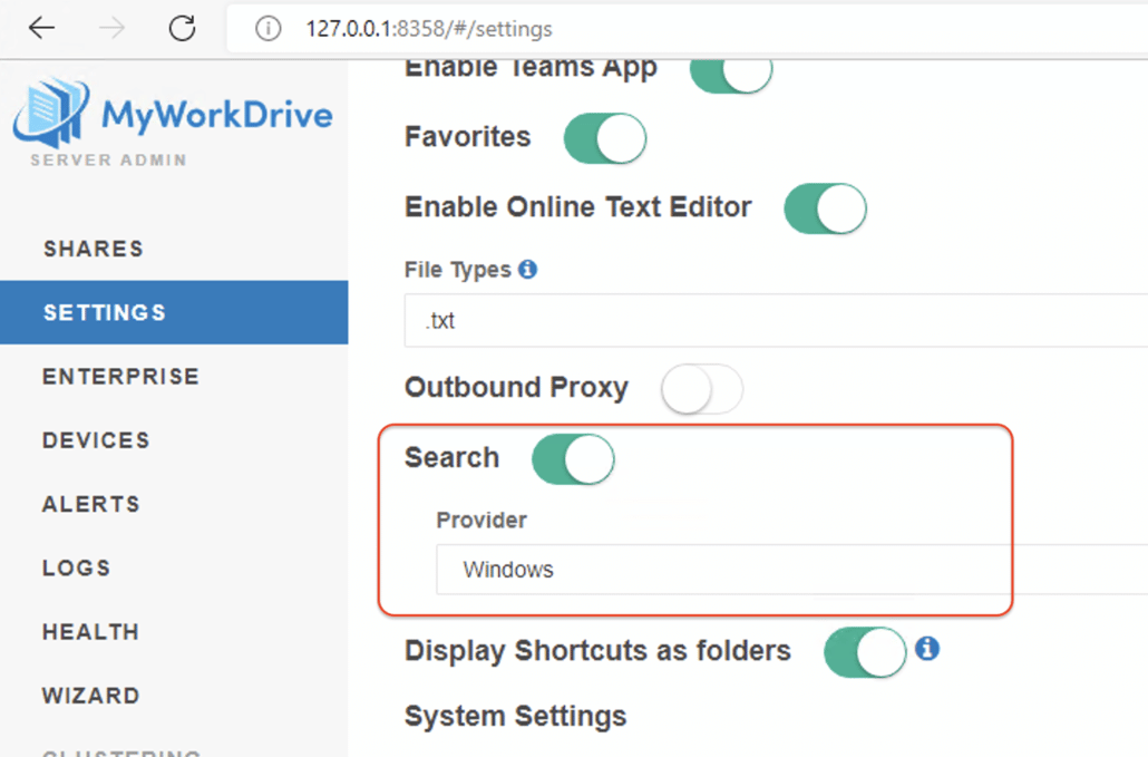Once the services are enabled, search is enabled, and indexing is complete, the indexing option in MyWorkDrive will then show as enabled when editing each share in the admin panel. Note for large file servers, this may take several hours.