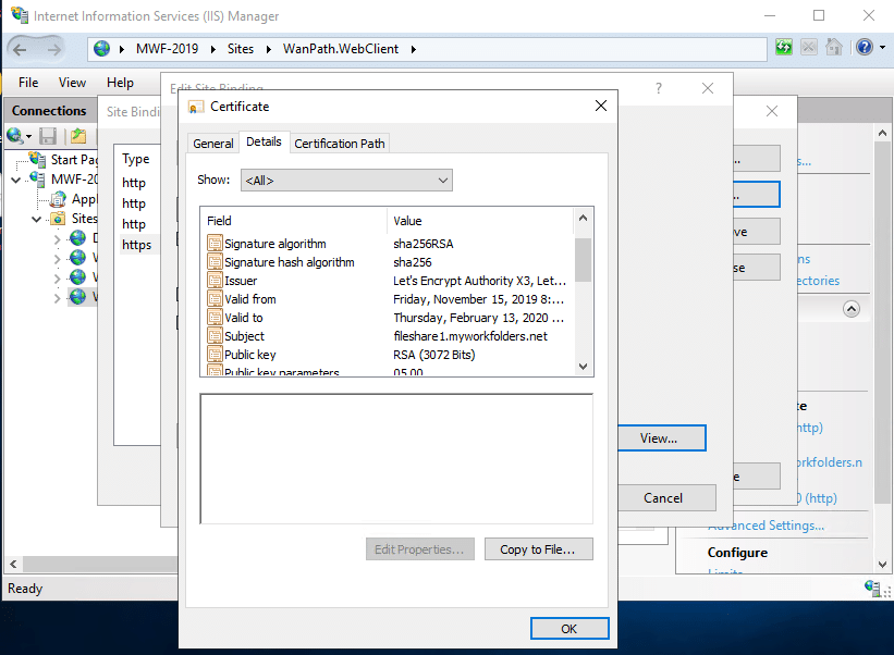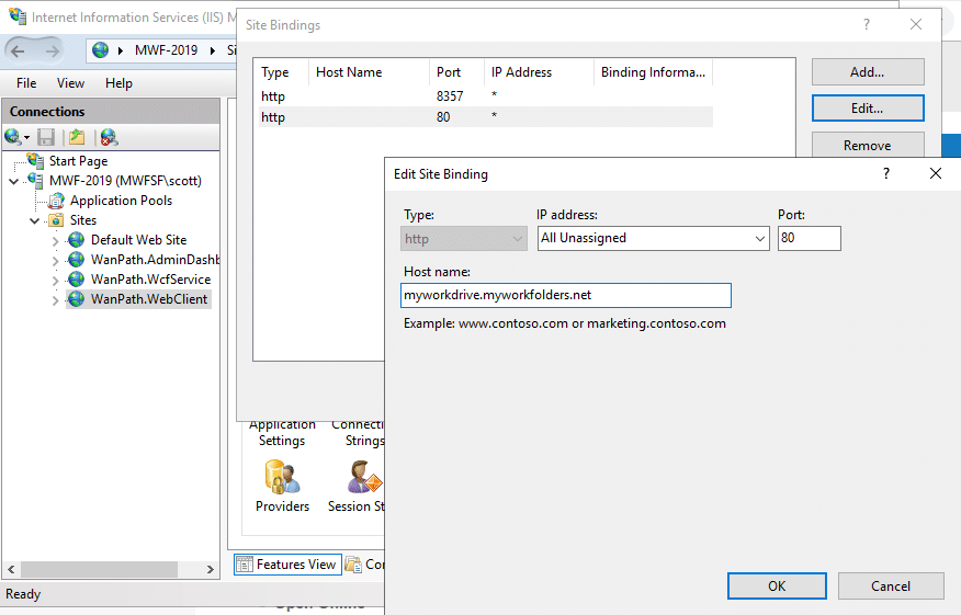 Open IIS, open the WanPath.WebClient site and click on Bindings. You should see that an HTTPS entry has been added for your site – in our case, fileshare1.myworkfolders.net