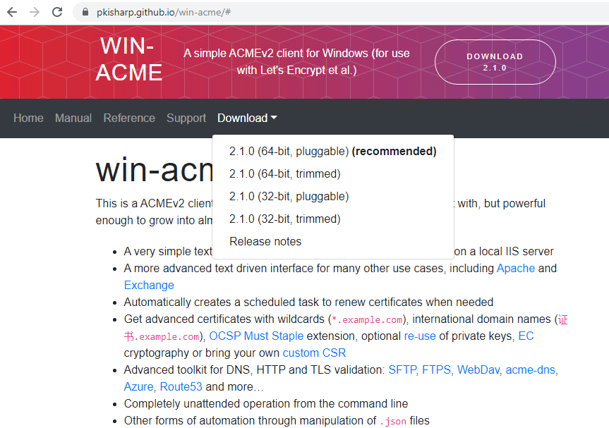 We’re going to use the Win-Acme client from PKI Sharp as our client on Windows to access LetsEncrypt. It's available for download as a .zip from https://pkisharp.github.io/win-acme/. There are many other clients available, and you may find one you like better. This one just happens to be one we’ve used reliably over the past few years.