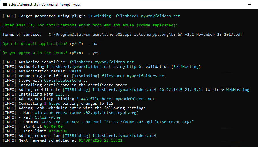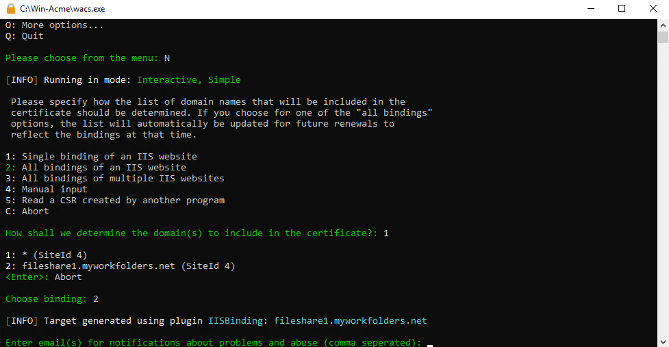 When prompted, enter your email. The Win-acme client will send you reminder emails to renew your site.