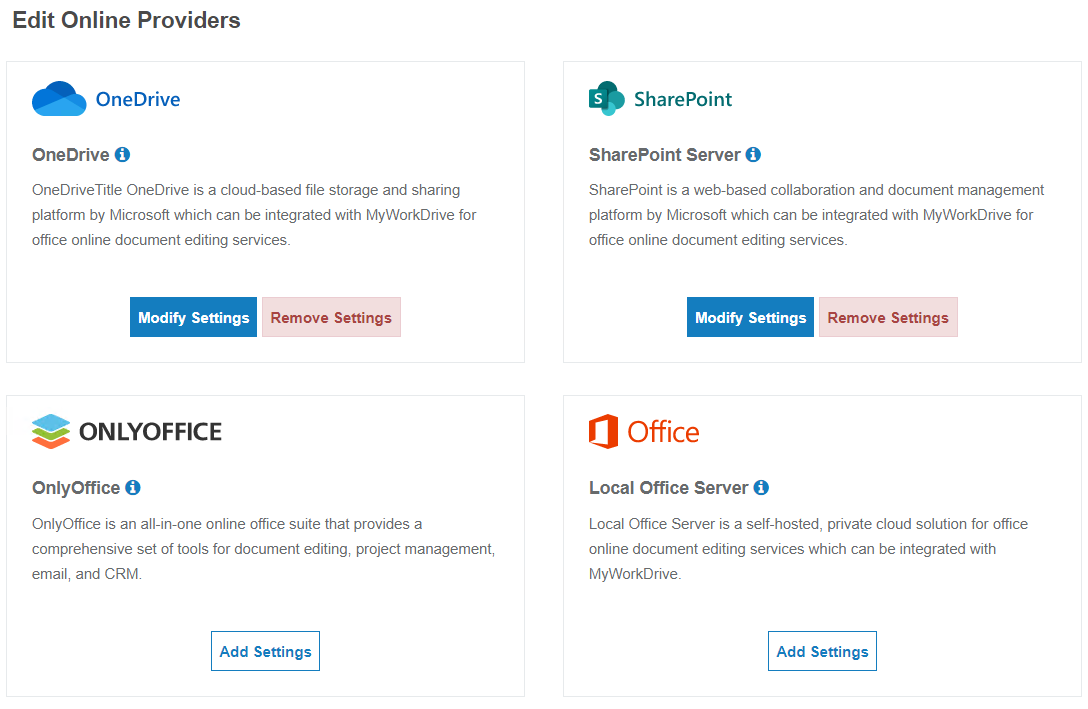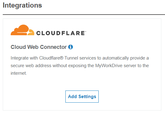 Starting with MyWorkDrive 6.4, we have added a new Integrations tab to server Administration. This provides a type of storefront as well as a easy-access management area for configuration of applications that can integrate with MyWorkDrive.
