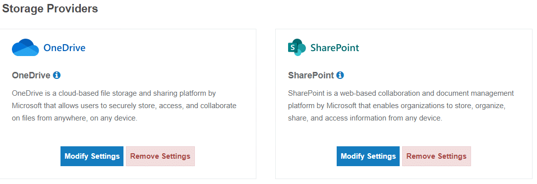 After enabling/configuring the desired service in the Settings or Enterprise tab, the selected option, as well as other possible options, can be viewed/configured within the Integrations tab.