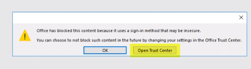 When users open Office documents in local Office from the web client, users with new/updated versions of Microsoft Office installed locally may receive a warning about opening documents from online sources, referencing the Trust Center.