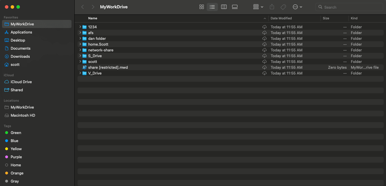 The MyWorkDrive macOS network drive client runs as an application on macOS and maps network drives on Macs directly in Finder, as if the computer were locally on the network. Once installed, Users can browse/copy/drag/drop/edit/delete and create files on their available network shares as if they were in the office!