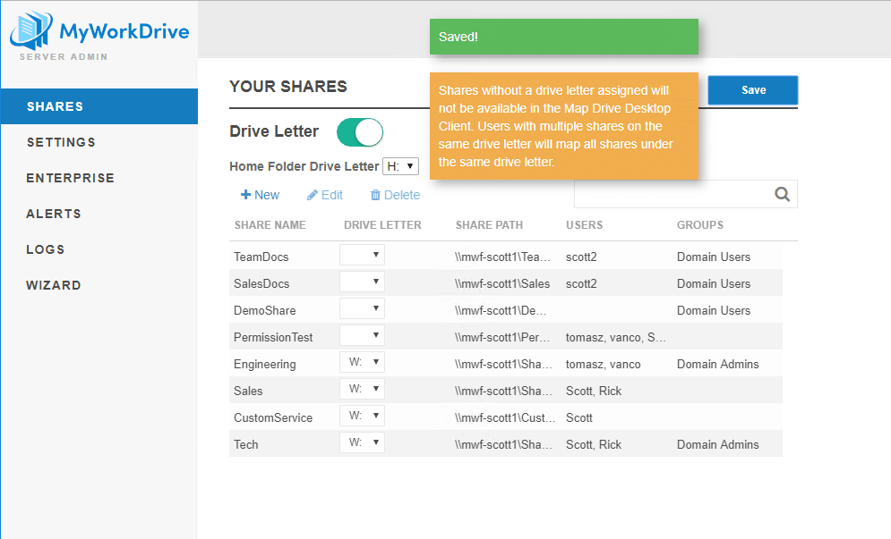If you do not assign a share a drive letter, that share will not be mapped by the map drive client. A note will be displayed on save to remind you of this fact.