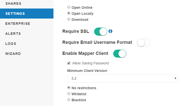 If you do not wish to permit users to log in with older mapped drive clients, you may specify the minimum mapped drive client version in settings.