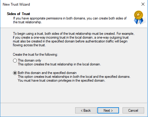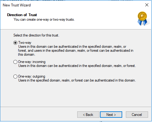 In this case, the trust is created on the Trusted Account Domain DC (the customer) pointed to the Resource Domain (where the MWD Server lives). Two-way trusts support selective authentication to limit permissions from the resource domain on the Trusted Account domain.
