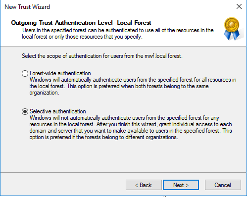 In this case, we set up a one-way outgoing trust to the MWD resource domain using an external domain trust.