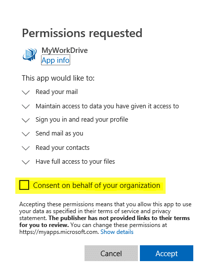 Alternatively, grant MyWorkDrive OneDrive permissions on behalf of your organization.
