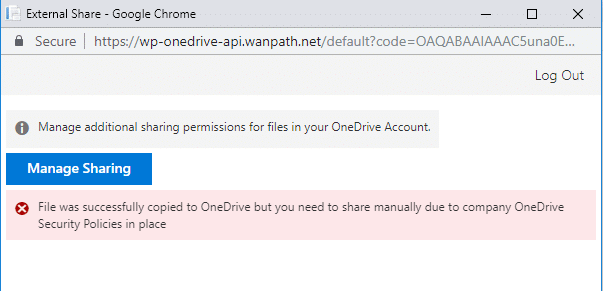 When attempting to share files externally using OneDrive, the user may be prompted with the following warning after uploading has completed.