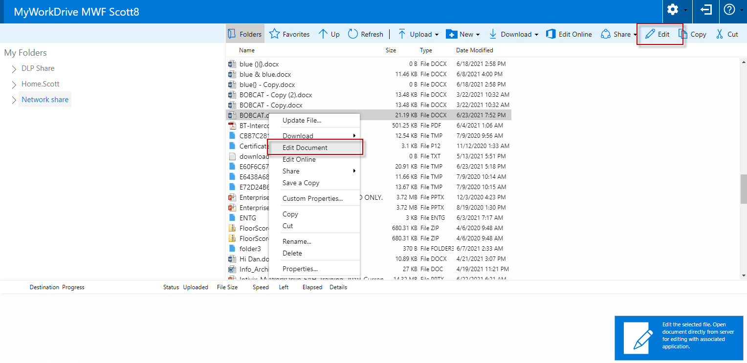The "edit document" option in the web client creates a connection to the Local office application installed on the user's desktop. The user will log in, and the document will be loaded for editing. Changes are saved directly back to the MyWorkDrive server.