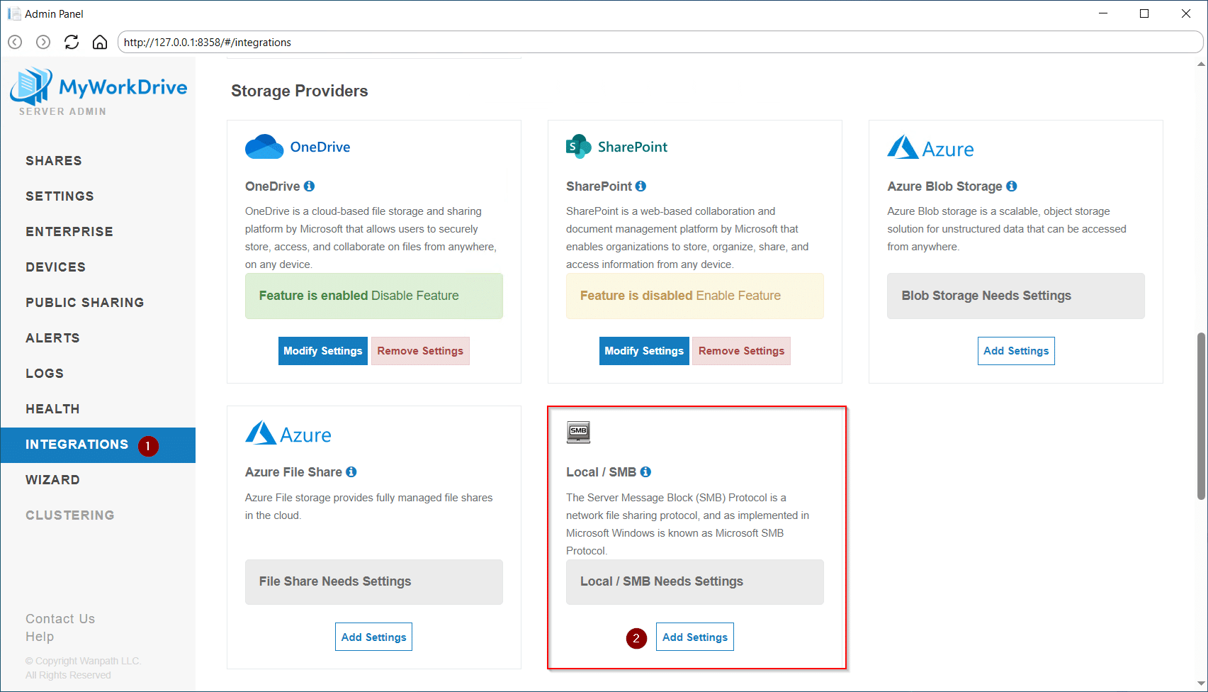Navigate to the Integrations tab, scroll down to Storage Providers, and select Add Settings or Modify Settings under Local / SMB.